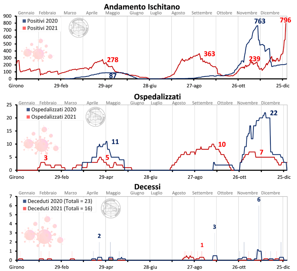 Una differenza di circa 2000 casi tra i due anni, dovuta anche al diverso numero di tamponi effettuati, novembre per il 2020 il mese con il massimo numero di contagi ed il numero massimo di contagi registrato in un giorno circa 80, agosto e dicembre per il 2021 con i 240 casi in un solo giorno dovuti alle varianti. I dati del contagio fanno riferimento alle persone dichiarate positive da piattaforma sinfonia sulla base della positività registrata da tamponi molecolari, la piattaforma secondo procedura nazionale, non conteggia i contatti diretti che seppur in isolamento e con tampone antigenico positivo risultano asintomatici.
