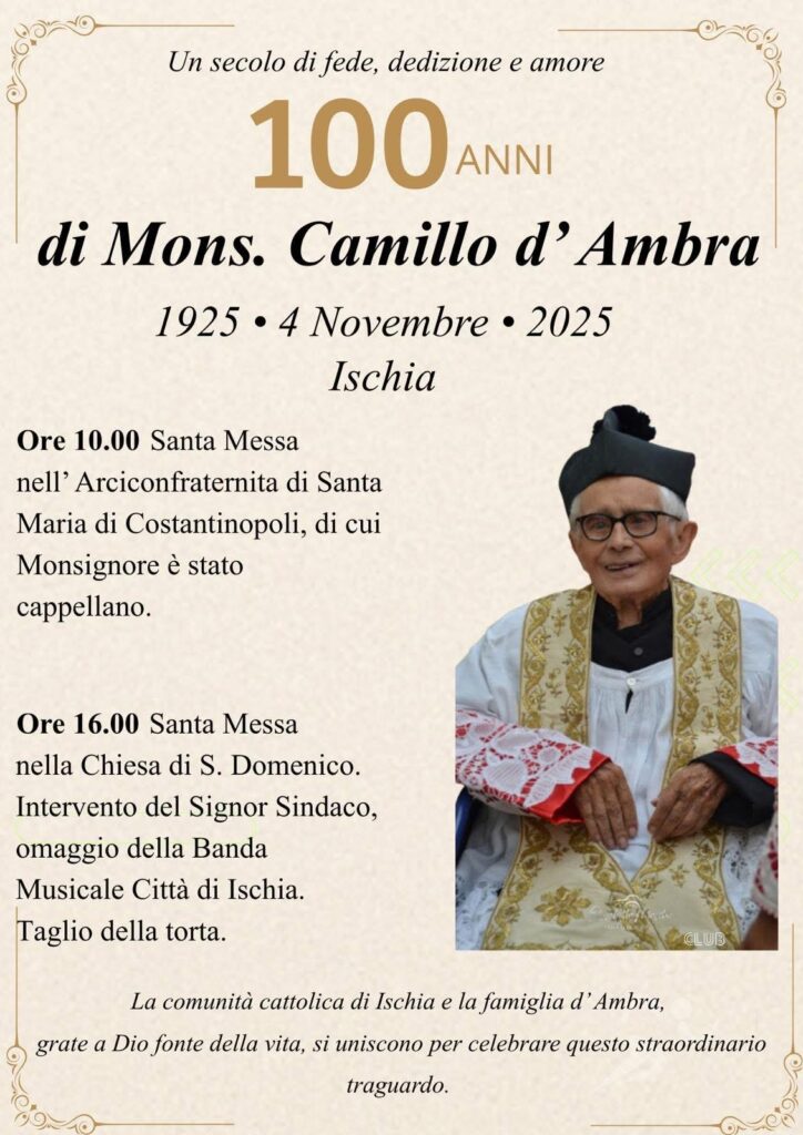 La comunità cattolica di Ischia si prepara a rendere omaggio a una figura straordinaria: Monsignor Camillo d’Ambra, che il 4 novembre 2025 compie 100 anni. Un secolo di vita dedicato con amore e fedeltà al servizio di Dio e della Chiesa, vissuto con profonda umiltà e instancabile dedizione.