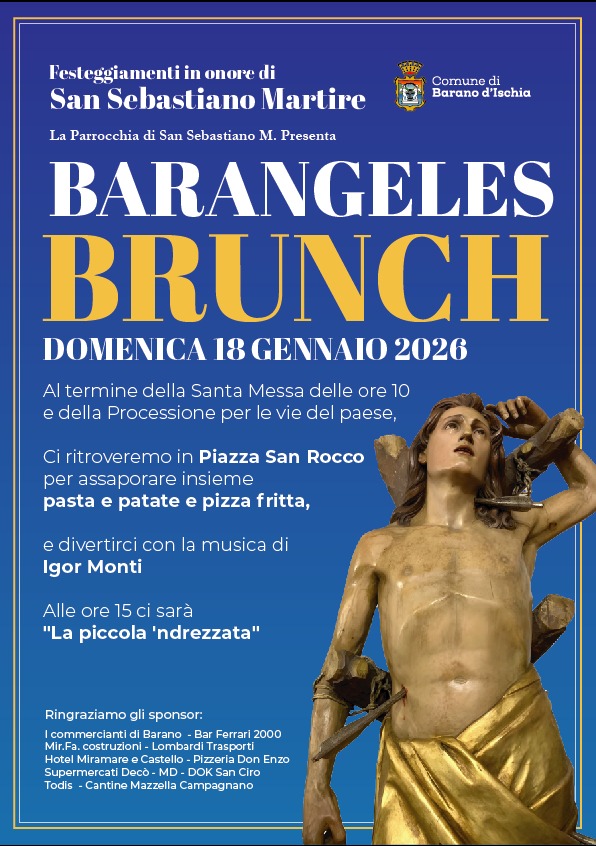 In Piazza San Rocco, Barano d’Ischia, il giorno 18 gennaio dalle ore 10 in occasione dei festeggiamenti in onore di San Sebastiano Martire, la Parrocchia di San Sebastiano M. e il Comune di Barano d’Ischia invitano tutta la cittadinanza a partecipare al Barangeles Brunch, un momento di condivisione, tradizione e musica.