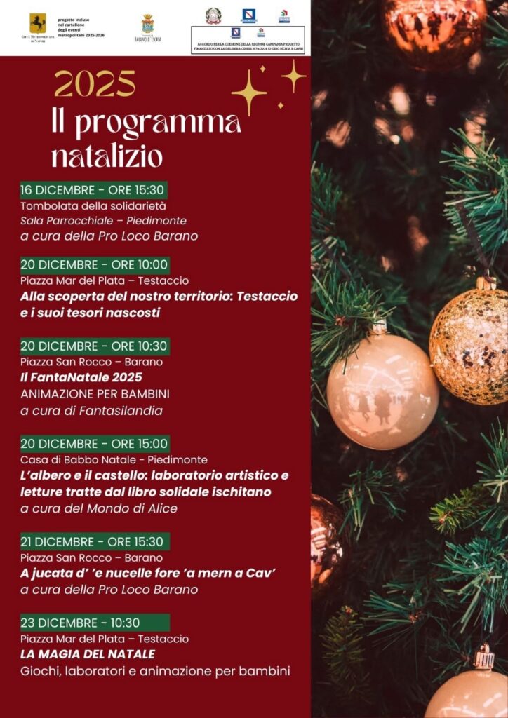 Il Comune di Barano d’Ischia presenta il programma completo delle festività natalizie 2025–2026, un ricco calendario di eventi che unisce tradizione, spettacolo, laboratori creativi e momenti di condivisione per grandi e piccoli. Di seguito, tutti gli appuntamenti in programma.