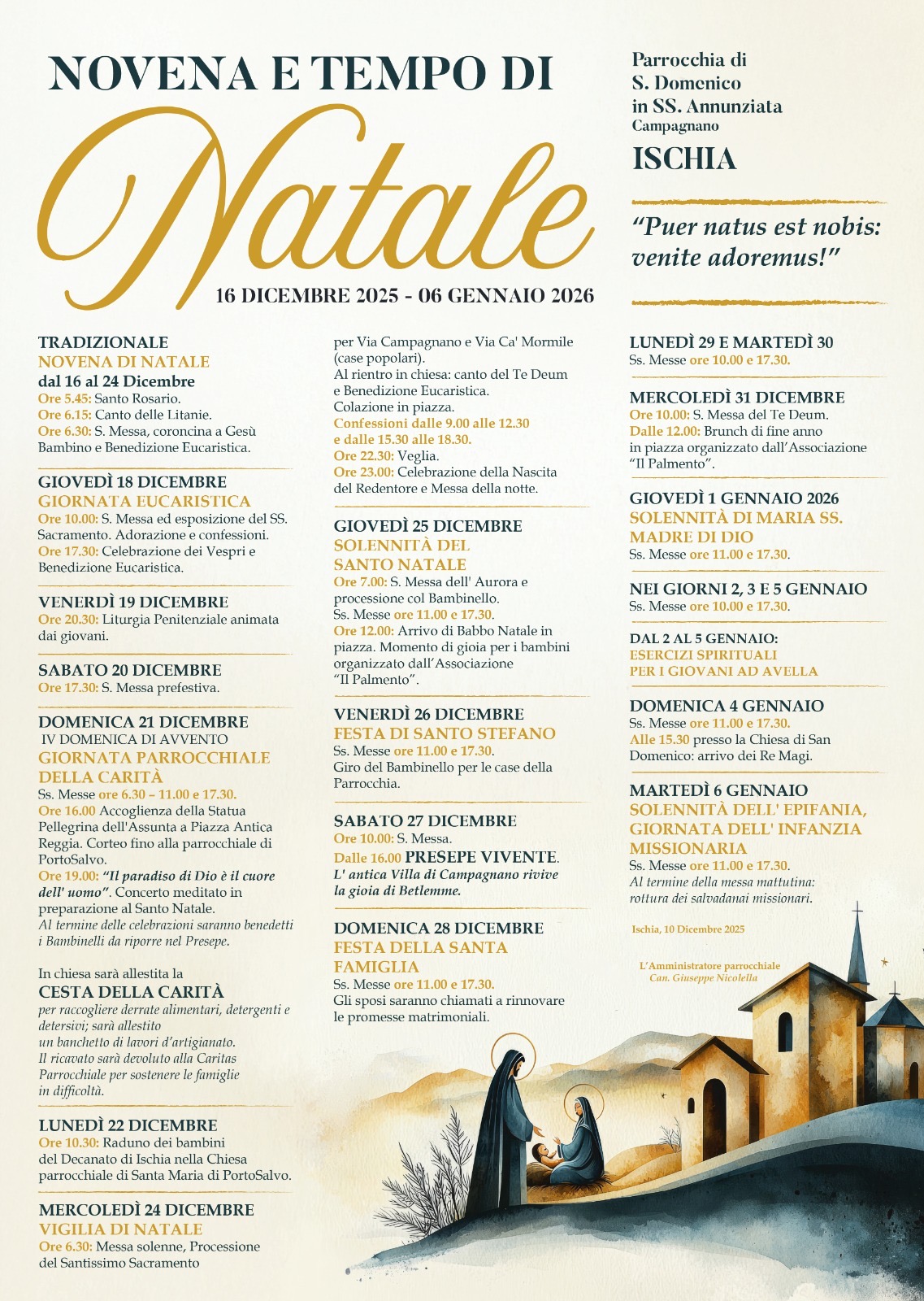 Anche quest’anno, la Parrocchia di S. Domenico in SS. Annunziata a Campagnano, Ischia, accoglie il tempo di Natale con un ricco programma di celebrazioni e iniziative che uniscono spiritualità, tradizione e momenti di festa per tutta la comunità.