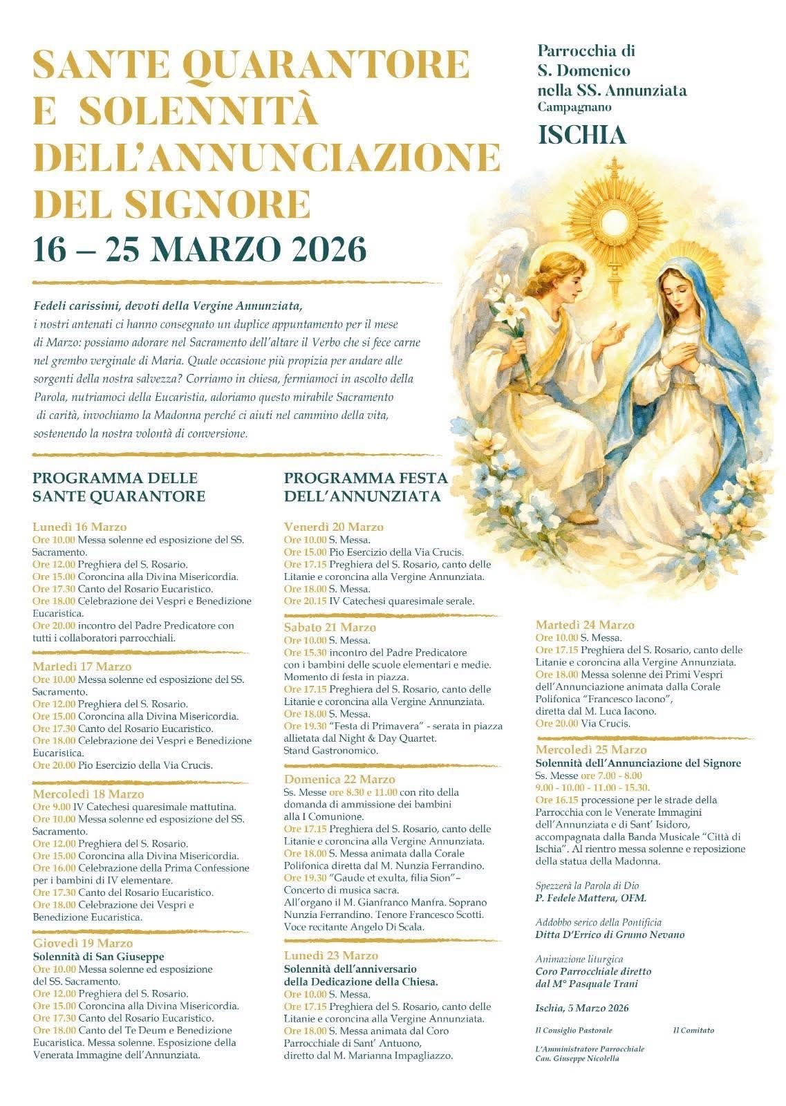 La comunità parrocchiale di Campagnano si appresta a vivere uno dei momenti più intensi e identitari dell’anno liturgico: le Sante Quarantore e la Solennità dell’Annunciazione del Signore, in programma dal 16 al 25 marzo 2026 presso la Parrocchia di San Domenico nella SS. Annunziata. Un appuntamento che affonda le radici nella storia del borgo e che continua a richiamare fedeli, famiglie e devoti della Madonna Annunziata.