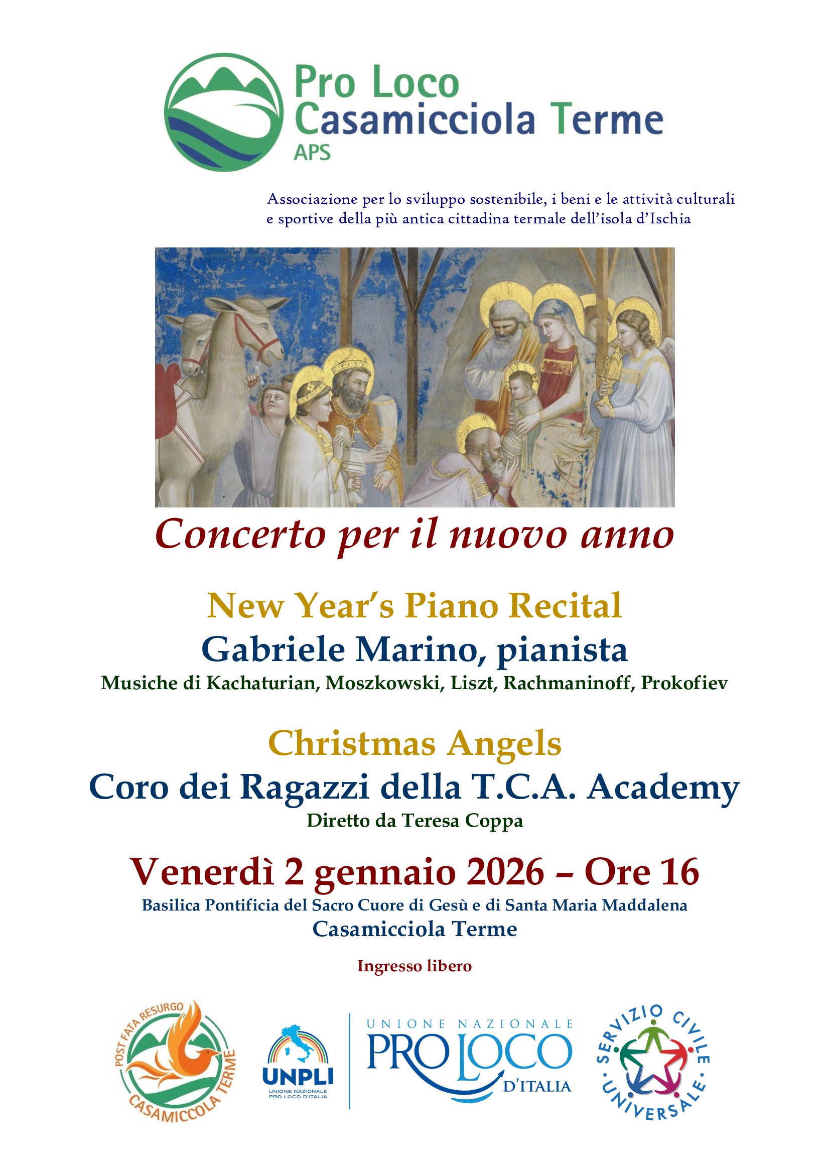 Si terrà venerdì 2 gennaio 2026 alle ore 16 presso la Basilica del Sacro Cuore di Gesù e di Santa Maria Maddalena di Casamicciola Terme il “Concerto per il nuovo anno” promosso dalla Pro Loco di Casamicciola Terme APS.