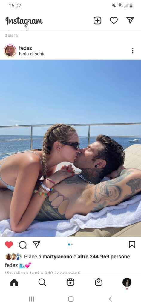 Tanti VIP scelgono ogni anno l’isola d’Ischia, molti la frequentano in incognita, altri invece fotografano i momenti piĂą belli delle loro vacanze mostrando le localitĂ in cui si trovano. E dopo l’emiro del Quatar di cui tanto si è parlato, proprio in queste ore a largo di Citara, a Forio, ci sono i “Ferragnez”. La famiglia è al completo con Chiara Ferragni, suo marito Fedez e i figli Leone e Vittoria, insieme a loro anche le sorelle della Ferragni con i rispettivi consorti. Sono tutti a bordo del lussuoso yacht che da giorni sta facendo il giro d’Italia. Sia Chiara Ferragni che Fedez hanno pubblicato foto sui propri profili instagram, la Ferragni (una delle influencer piĂą importanti al mondo) ha pubblicato una storia con un selfie e la scritta CIAO ISCHIA. Sicuramente uno spot importante per l’isola che ovviamente a sua volta impreziosisce le vacanze dei Ferragnez.