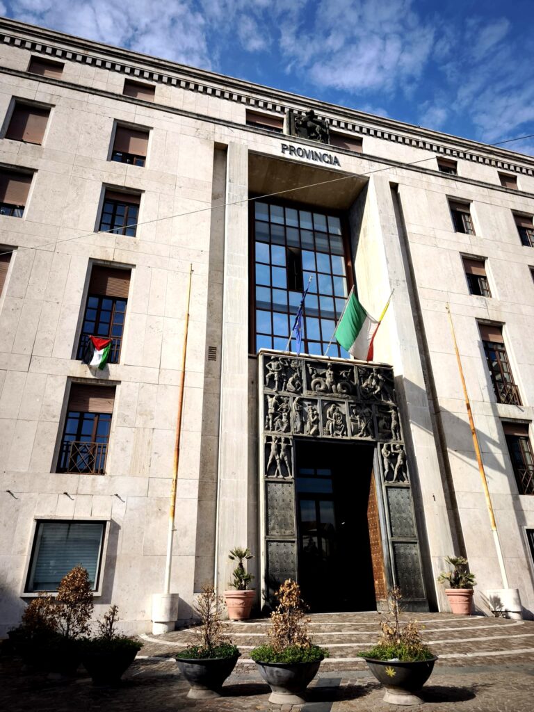 Dopo la mozione approvata all’unanimità nel corso dell’ultimo Consiglio Metropolitano, personale incaricato della Città Metropolitana ha esposto, quest’oggi, sulla facciata prospiciente piazza Matteotti, il vessillo con il tricolore orizzontale con bande nera, bianca e verde, sormontato da un triangolo rosso a sinistra, simbolo dello Stato di Palestina e del popolo palestinese.