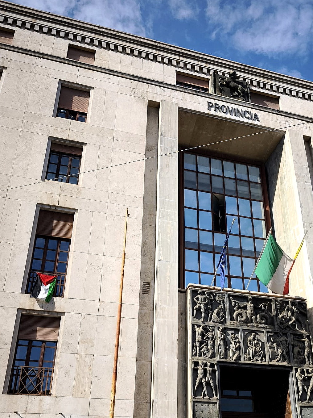 Dopo la mozione approvata all’unanimità nel corso dell’ultimo Consiglio Metropolitano, personale incaricato della Città Metropolitana ha esposto, quest’oggi, sulla facciata prospiciente piazza Matteotti, il vessillo con il tricolore orizzontale con bande nera, bianca e verde, sormontato da un triangolo rosso a sinistra, simbolo dello Stato di Palestina e del popolo palestinese.