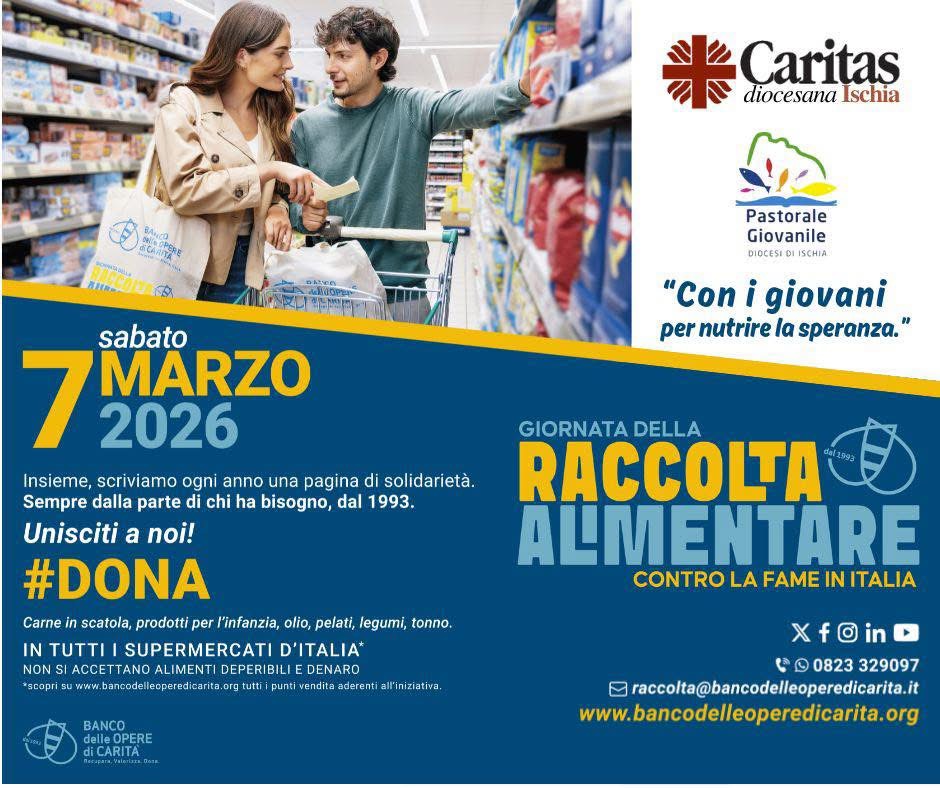 La raccolta si svolgerà in tutti i supermercati d’Italia aderenti all’iniziativa, consultabili sul sito ufficiale del Banco delle Opere di Carità. A Ischia, la presenza dei giovani della Pastorale e dei volontari Caritas renderà la giornata un momento di condivisione, servizio e speranza.