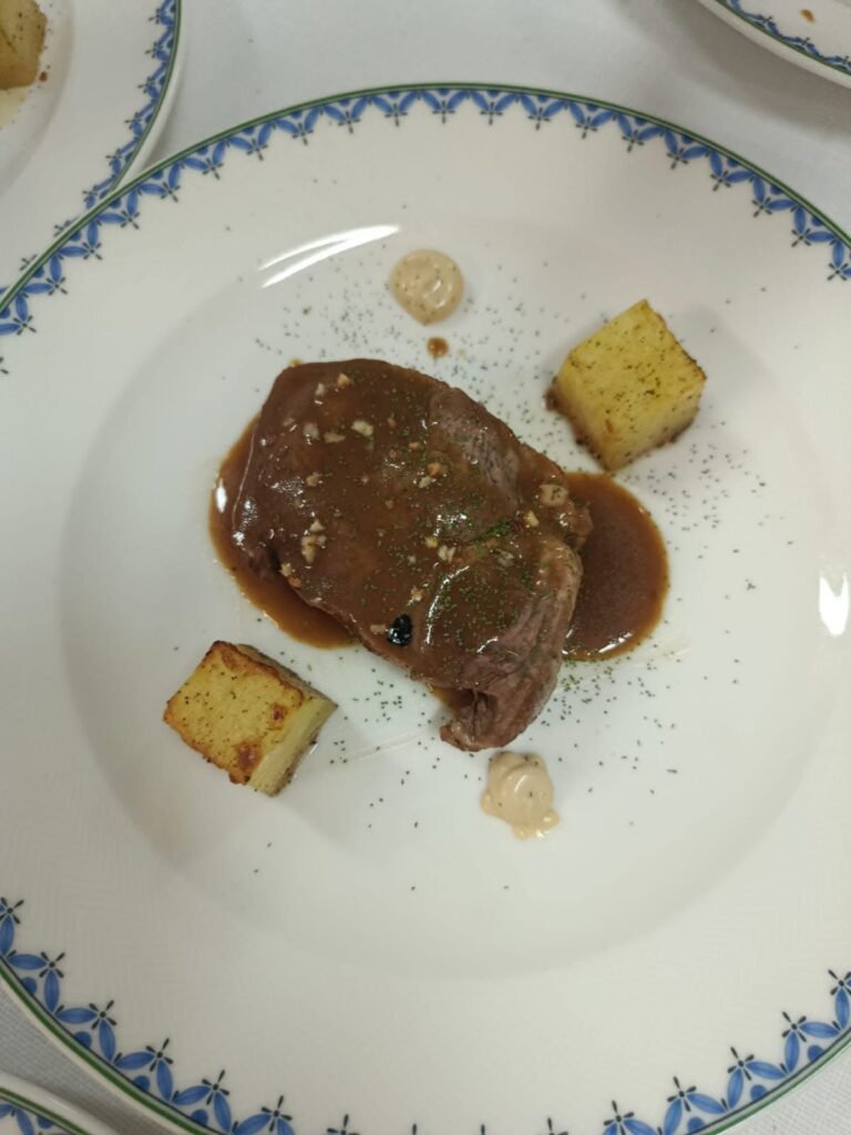 • Secondo piatto: Filetto di maiale con maionese di nocciole e patate, servito con Asti Spumante Dolce Rosa Regale DOCG.