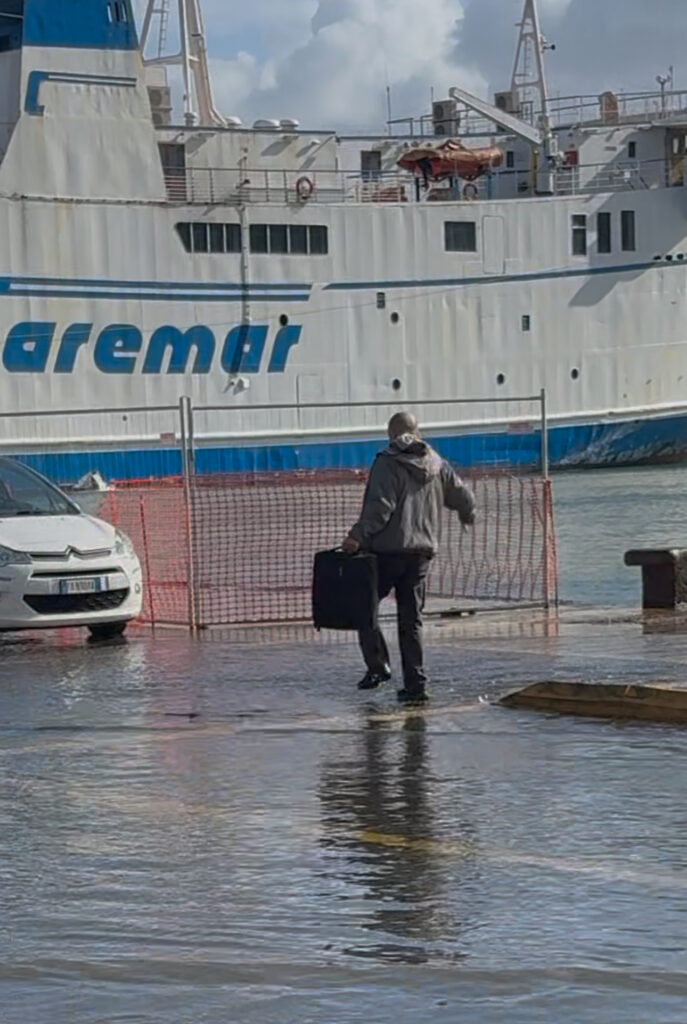 Intorno, mentre Laraspata parla, l’acqua continua a lambire la banchina. I turisti scattano foto, qualcuno si toglie le scarpe per non rovinarle, altri cercano di saltare tra le pozzanghere. È un’immagine che racconta più di mille parole: un porto che non riesce più a stare al passo con un mare che cambia.
