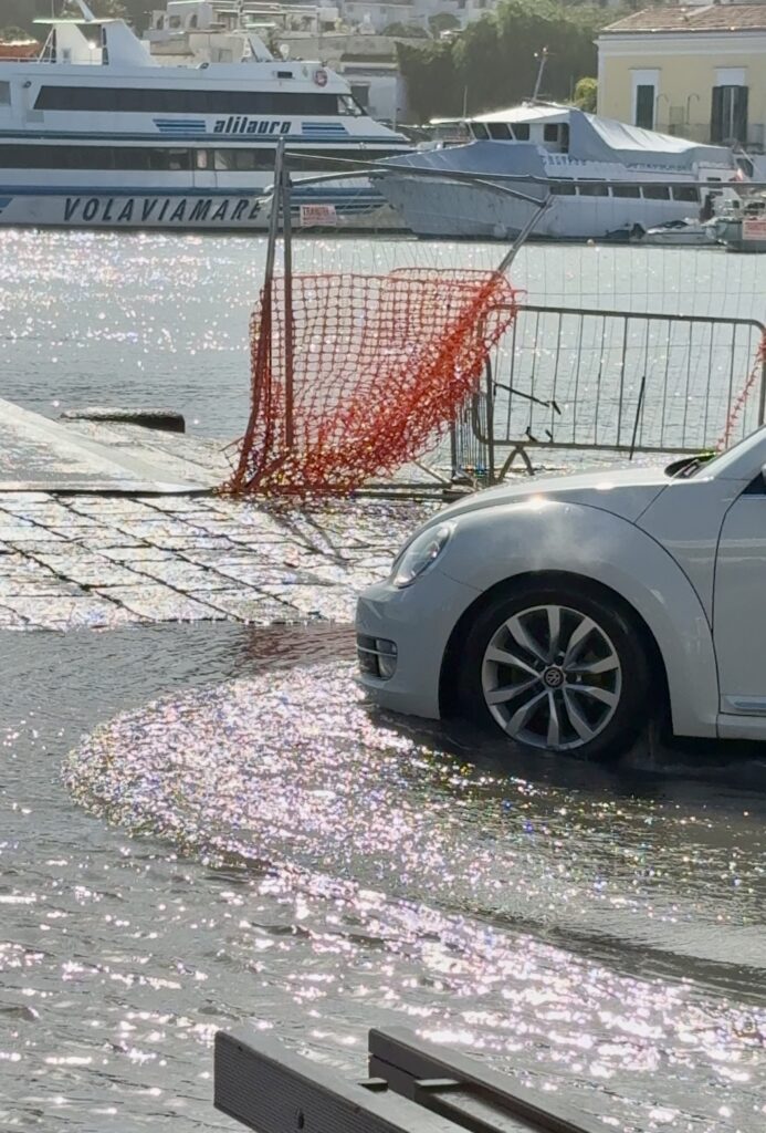 Ischia – Alla Banchina Olimpica la scena si ripete identica, quasi fosse un rituale ormai accettato. Il traghetto attracca, le passerelle si abbassano, e i passeggeri – valigie alla mano, bambini in braccio, anziani che cercano equilibrio – si ritrovano davanti a una distesa d’acqua che copre la banchina. Non c’è alternativa: bisogna camminare dentro il mare per scendere o salire a bordo.