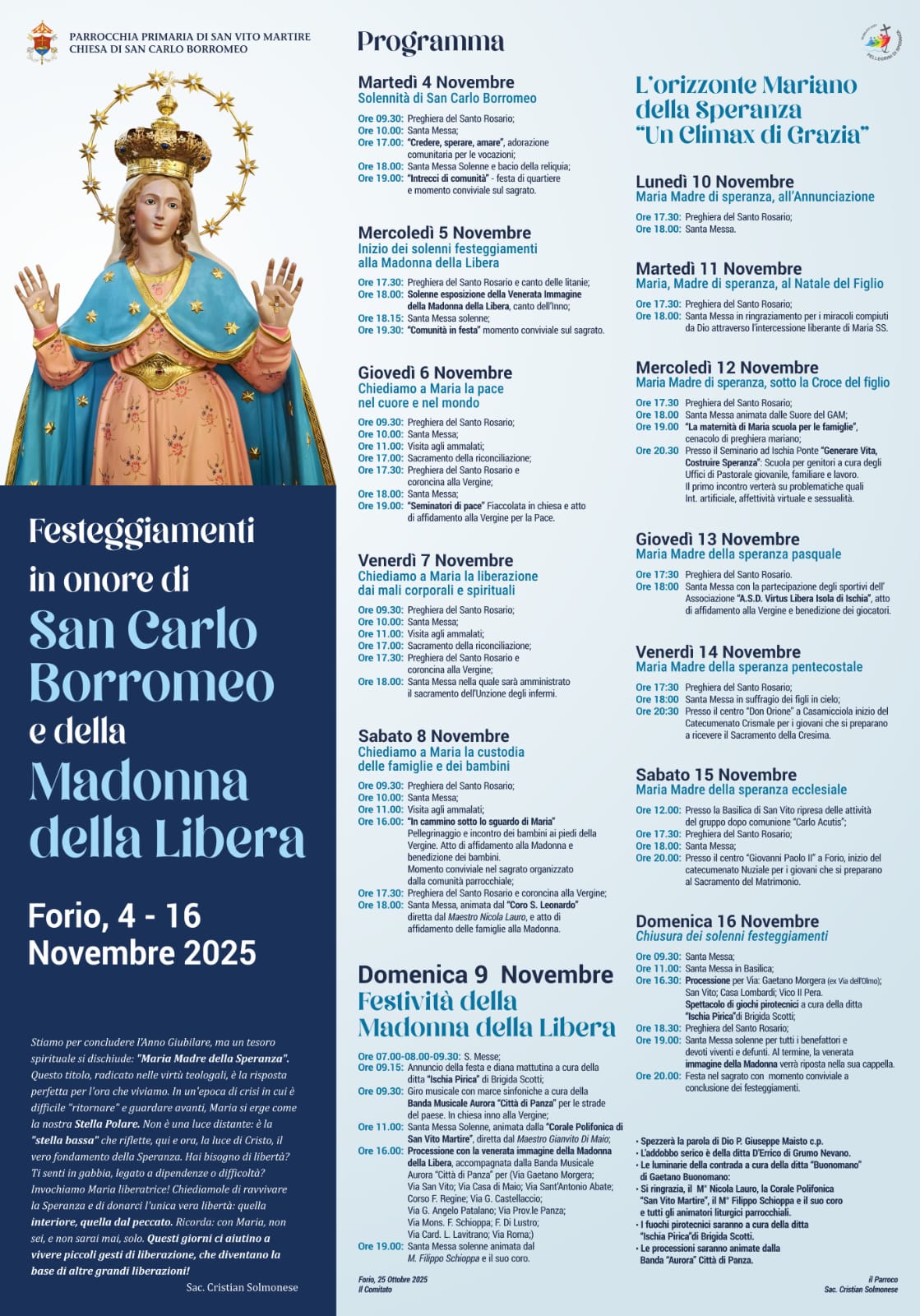 Dal 4 al 16 novembre 2025, la comunità di Forio si raccoglie attorno alla Parrocchia di San Vito Martire e alla Chiesa di San Carlo Borromeo per vivere intensamente i festeggiamenti in onore di San Carlo Borromeo e della Madonna della Libera. Un evento che non è solo tradizione, ma un vero e proprio itinerario spirituale, guidato dal tema profondo e attuale: _Maria Madre della Speranza_.