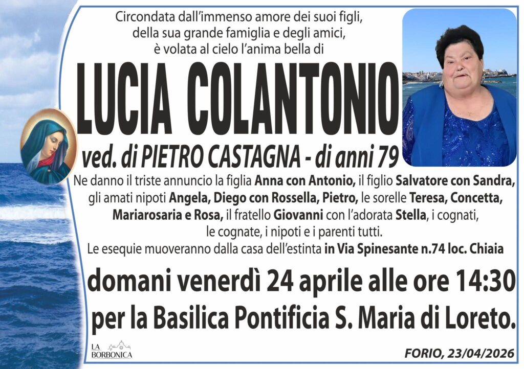 È volata al cielo l’anima bella di Lucia Colantono, vedova di Pietro Castagna, di anni 79. Ne danno il triste annuncio la figlia Anna con Antonio, il figlio Salvatore con Sandra, gli amati nipoti Angela, Diego con Rossella, Pietro, le sorelle Teresa, Concetta, Mariarosaria e Rosa, il fratello Giovanni con l’adorata Stella, i cognati, le cognate, i nipoti e i parenti tutti.