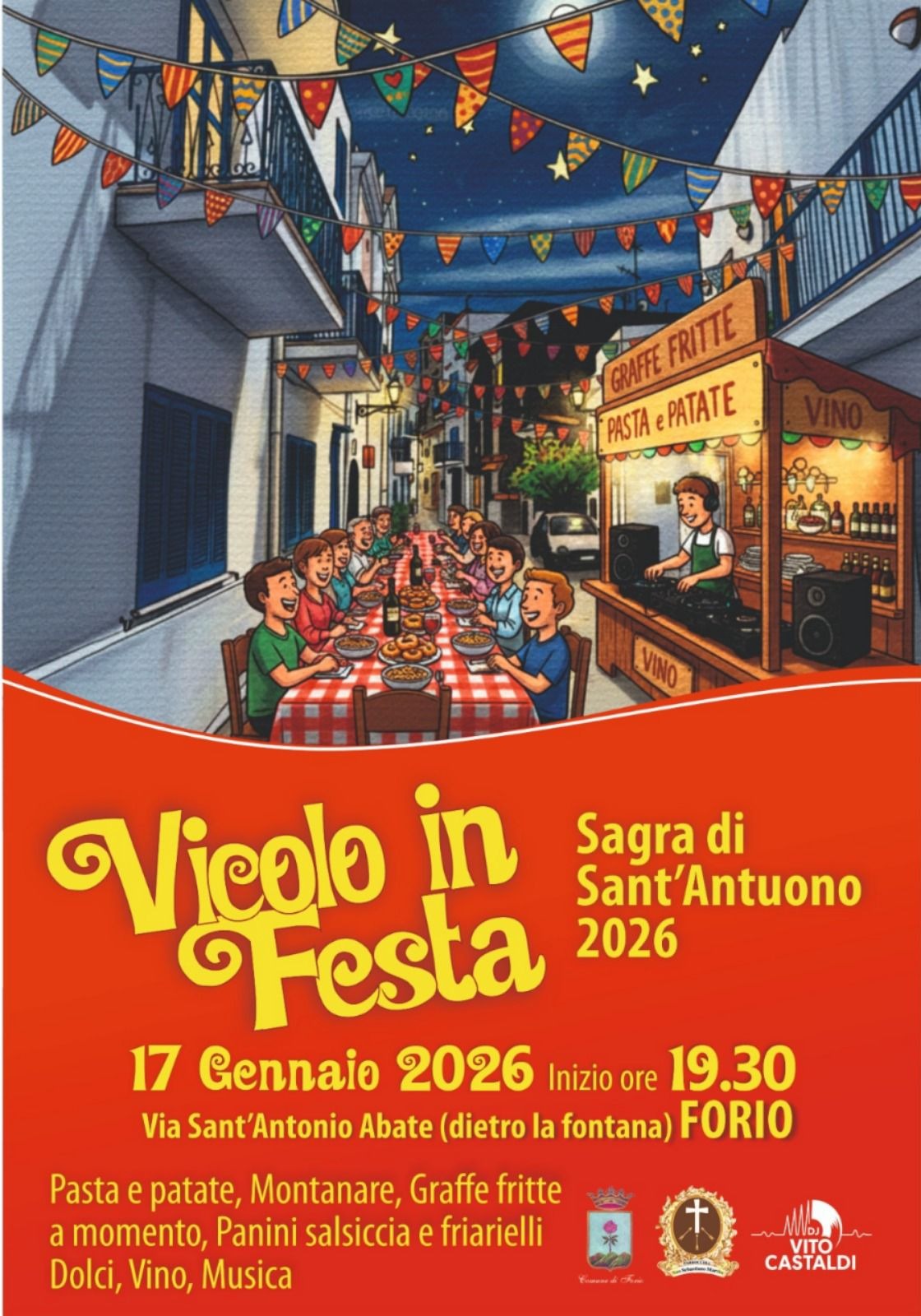 FORIO – Il 17 gennaio 2026 Forio accende i riflettori sulla tradizione con “Vicolo in Festa – Sagra di Sant’Antuono”, uno degli appuntamenti più attesi dell’inverno isolano. L’evento, che prenderà il via alle 19.30 in via Sant’Antonio Abate (dietro la fontana), promette una serata all’insegna di sapori autentici, musica e convivialità.