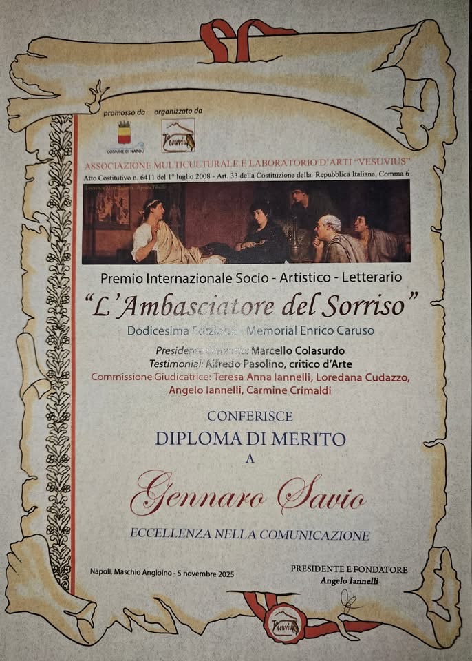 Il premio, dedicato quest’anno alla memoria del grande tenore Enrico Caruso, ha celebrato personalità che si sono distinte per il loro contributo umano e professionale in diversi ambiti. Tra i premiati, insieme a Gennaro Savio, anche figure di spicco come il tenore di fama internazionale Francesco Malapena, lo storico giornalista Rai Gianfranco Coppola, il caporedattore di Agenzia Stampa Italia Rosario Lavorgna, l’attore comico Peppe Laurato e numerose eccellenze nei campi dell’arte orafa, della pittura e della letteratura.