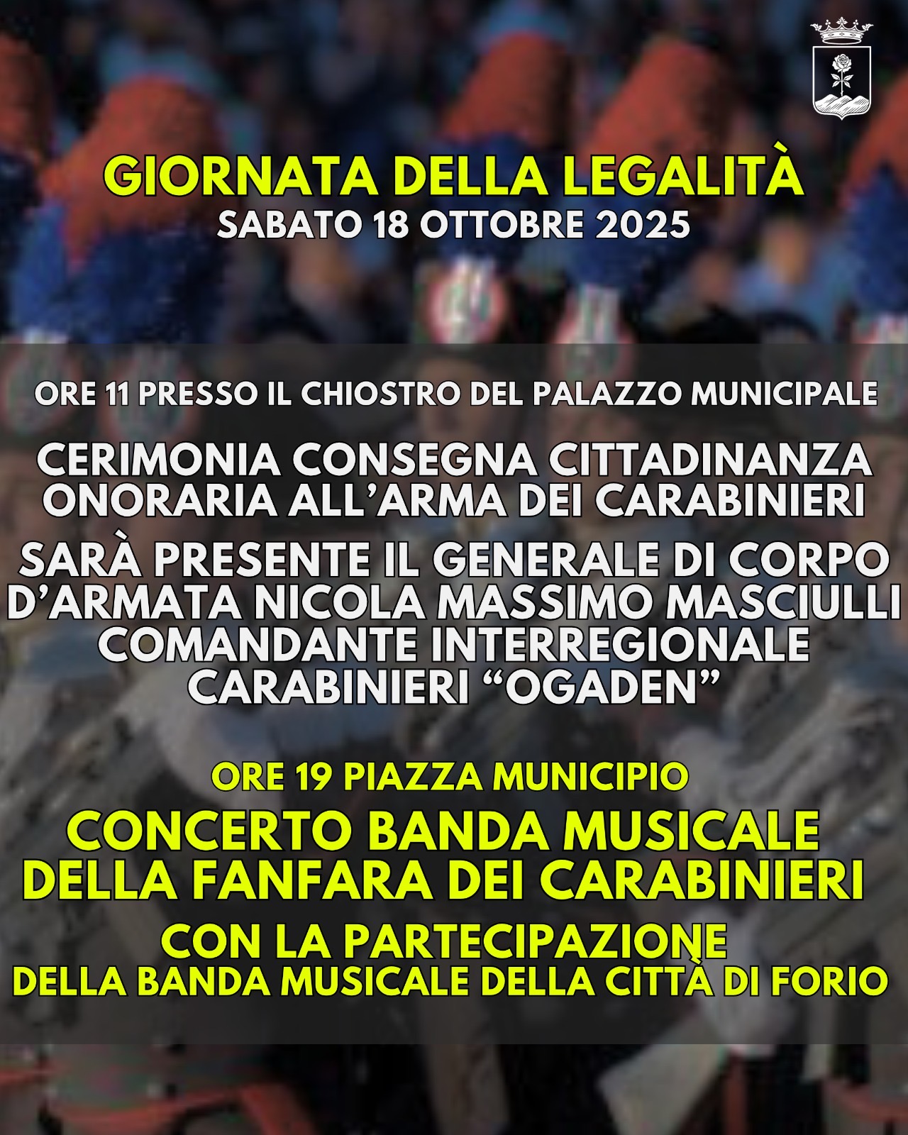 Sabato 18 ottobre 2025, Forio si prepara a vivere una giornata all’insegna della legalità e del riconoscimento istituzionale. Il Comune ha organizzato una doppia iniziativa per rendere omaggio all’Arma dei Carabinieri, simbolo di impegno e tutela dei cittadini.