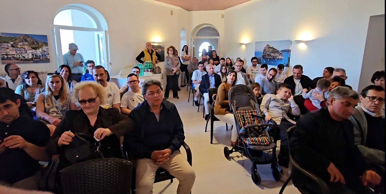 Strapiena la sala convegni dell’Hotel Michelangelo a Lacco Ameno per una mattinata ricca di emozioni e commozione trascorsa all’insegna dell’umanità e della solidarietà. Oltre che al giornalista libanese di fama internazionale Talal Khrais grazie al quale la notizia della 5^ edizione del Premio è stata diffusa in tutto il Medio Oriente, il Premio è stato assegnato alla memoria del piccolo Leo Bailey, agli atleti speciali dell’Ischia Baskin, ad Angelo Iannelli, Ida Trofa, Ciro Cenatiempo, Franco Di Iorio, Paolo Esposito, Vito Iacono, Domenico Castagna, Davide Granato, Pasquale Patalano, Ciro Sasso e Paco Patalano. Presente a sorpresa l’ex parlamentare europeo Franco Iacono a cui è stata consegnata una ceramica del Premio. Bellissimo ed eloquente il messaggio video giunto dal Prof. Louis Godart.
