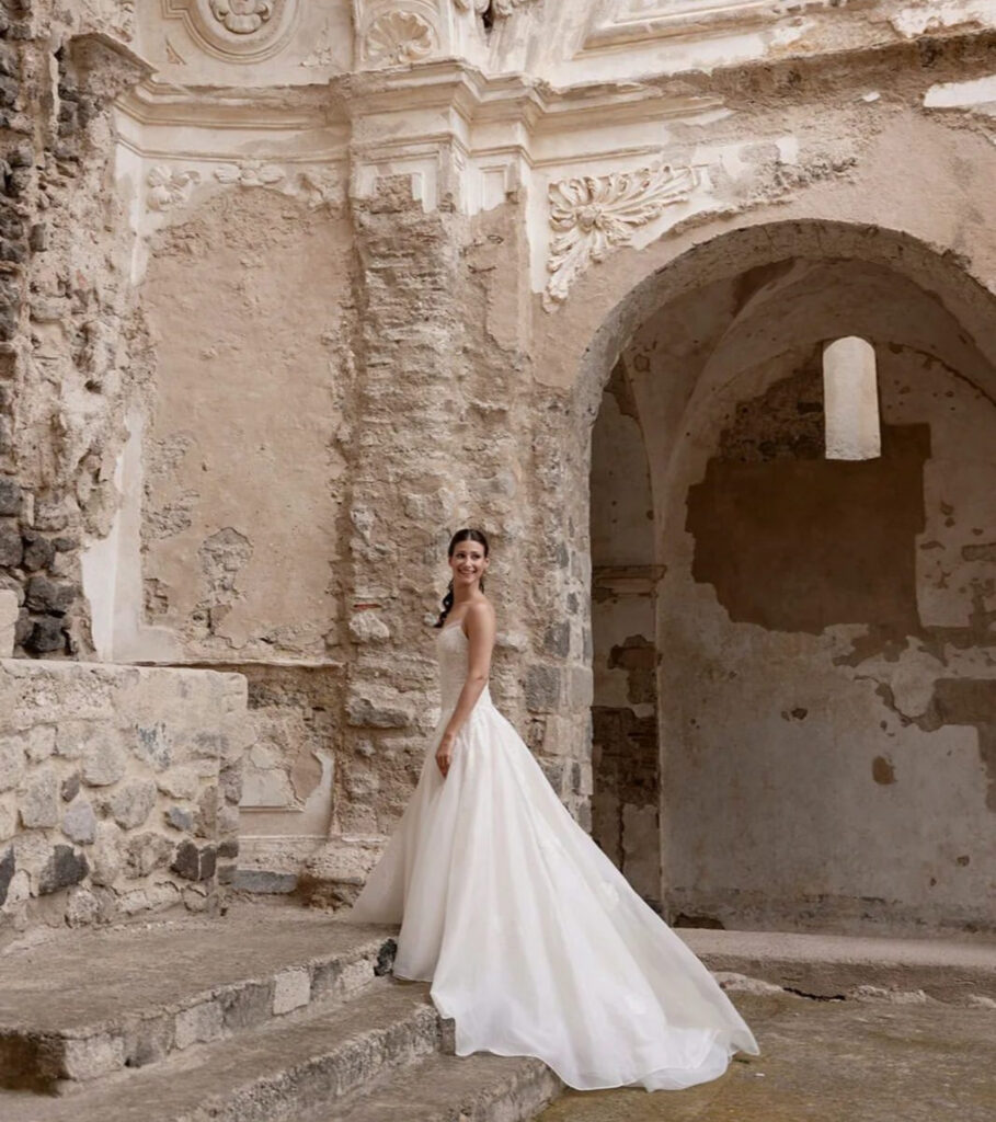 La sposa ha scelto un abito di pizzo con drop waist e un delicato dettaglio origami, un modello che ha esaltato la sua eleganza nella splendida cornice del Castello Aragonese e che ha attirato l’attenzione degli esperti di moda.