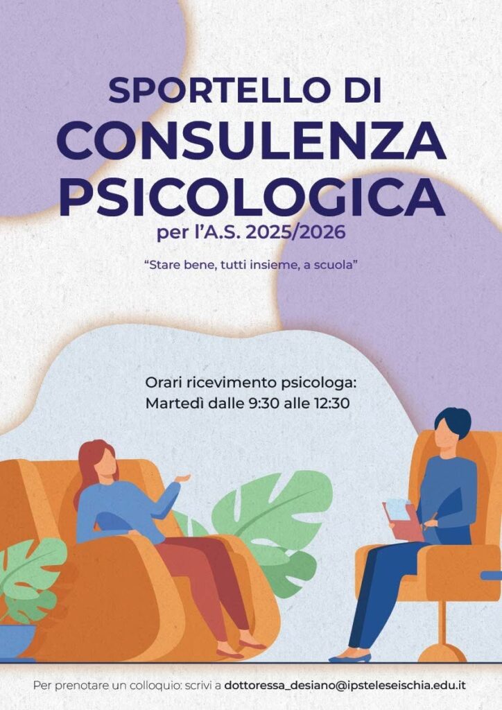 A partire dal 10 ottobre 2025, l’Istituto Professionale Statale *Vincenzo Telese* di Ischia attiverà lo Sportello di Consulenza Psicologica, un servizio fondamentale pensato per accompagnare studenti, famiglie e personale scolastico lungo tutto l’anno scolastico 2025/26.