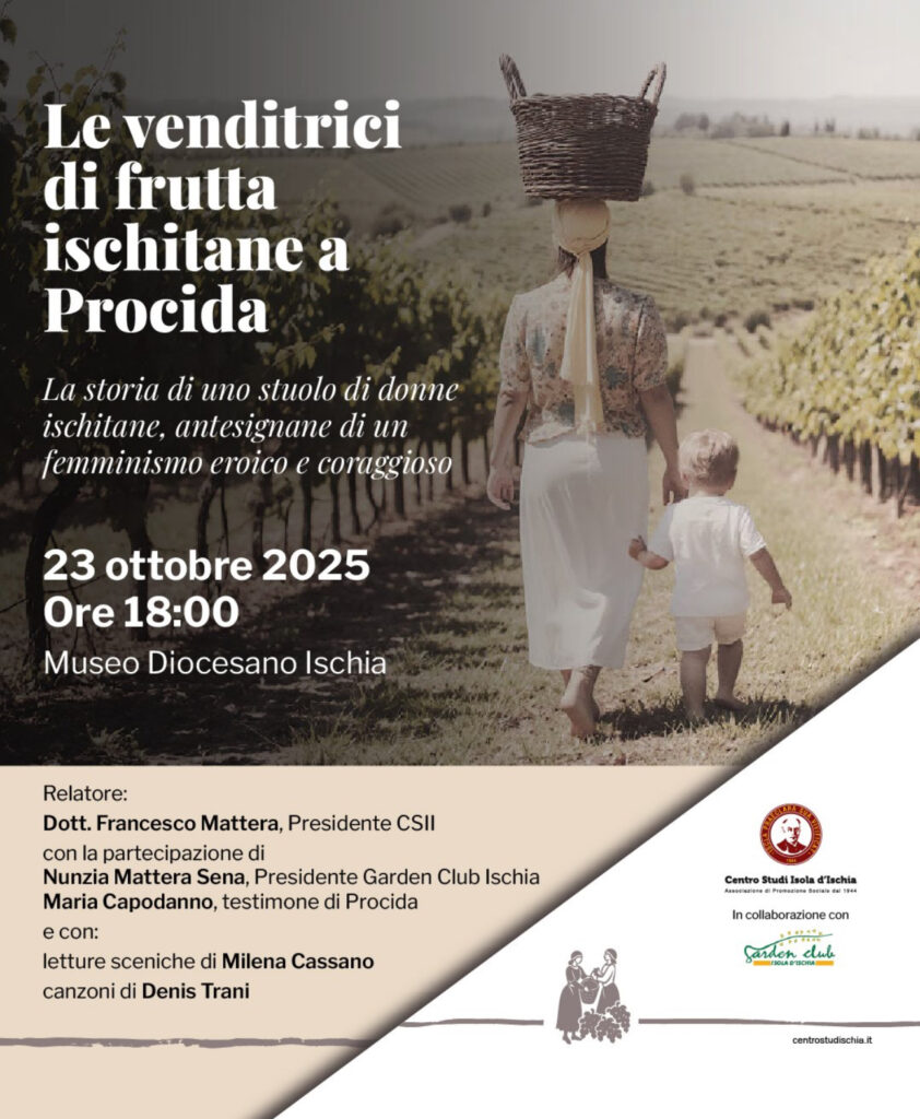 Il 23 ottobre 2025, alle ore 18:00, presso la sala Antonio Pagano del Museo Diocesano di Ischia, il Centro Studi Isola d’Ischia – APS organizza un evento culturale dedicato alla memoria delle venditrici di frutta ischitane, protagoniste di una pagina poco conosciuta ma profondamente significativa della storia locale. Donne che, con forza e dignità, attraversavano il mare per raggiungere Procida e garantire il sostentamento delle proprie famiglie, incarnando un femminismo ante litteram.