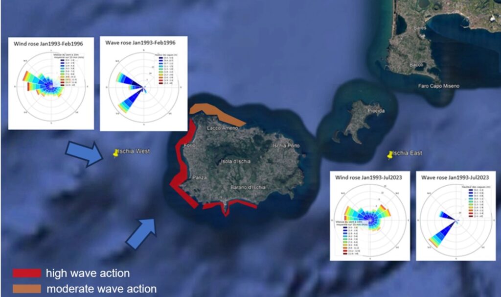 Per analizzare vento e moto ondoso, lo studio utilizza dataset globali come ERA5 e il Copernicus Marine Service, che forniscono serie storiche e previsioni ad alta risoluzione. Le statistiche sono state elaborate per i versanti orientale e occidentale dell’isola, evidenziando differenze nei regimi ondosi e nelle rose dei venti.