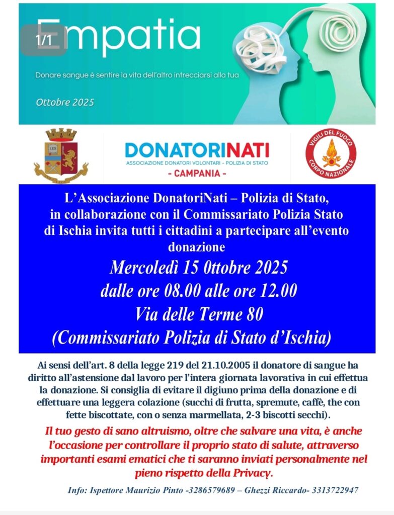 L’Associazione DonatoriNati – Polizia di Stato, in collaborazione con il Commissariato di Polizia di Stato di Ischia, invita tutti i cittadini a partecipare alla giornata dedicata alla donazione del sangue. L’evento si svolgerà mercoledì 15 ottobre 2025, dalle ore 08.00 alle ore 12.00, presso la sede del Commissariato in Via delle Terme 80.