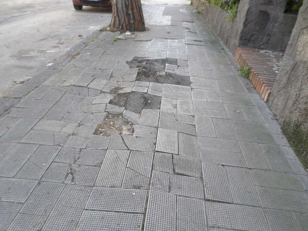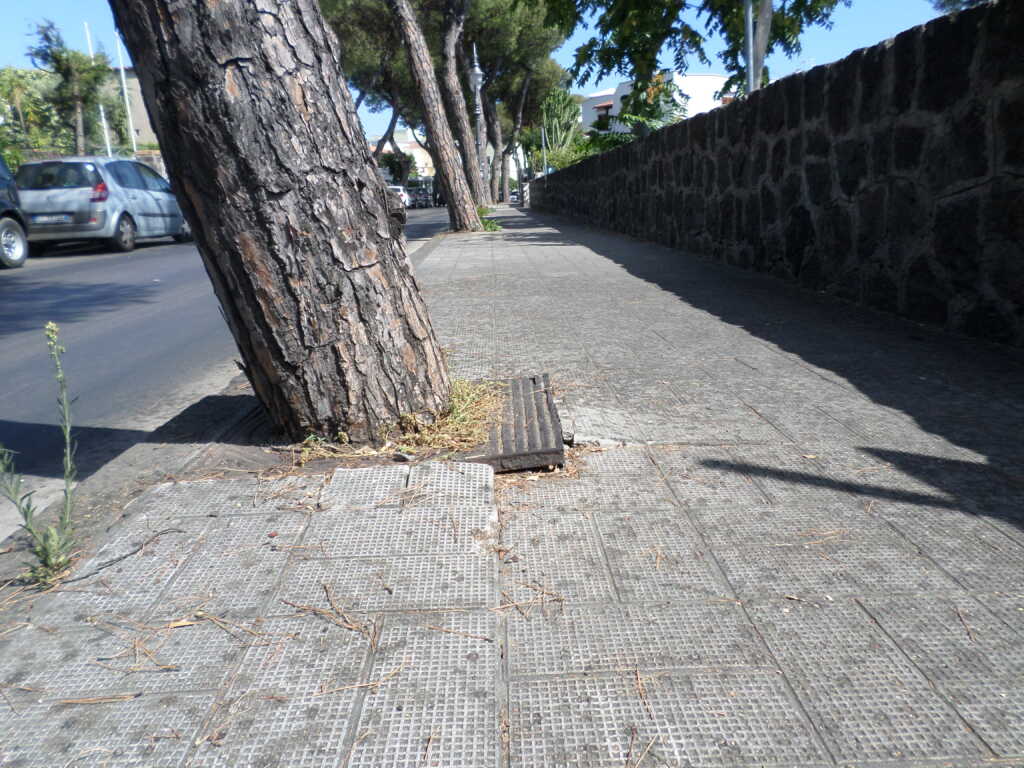 Sui marciapiedi che costeggiano la strada si alternano buche e rotture varie. Le maioliche mancano in diversi tratti e le grate arrugginite alla base dei pini rimossi sono pronte a ferire. Difficoltà che diventano insormontabili per le persone anziane e ancor più per quelle diversamente abili.
