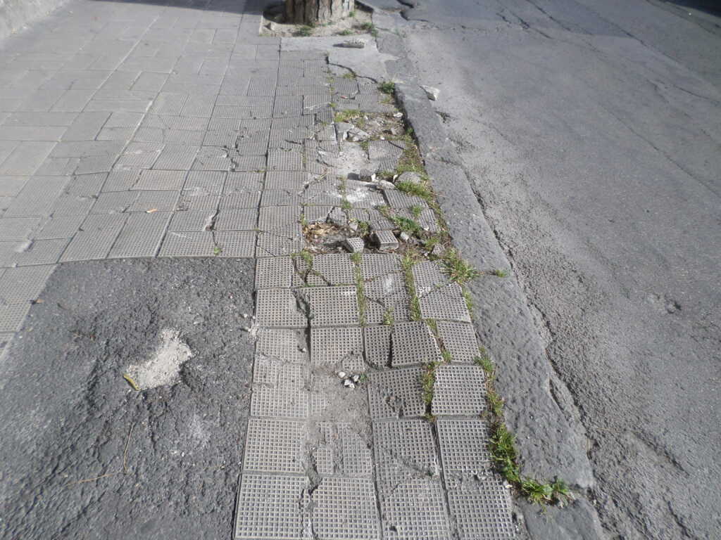 Qualche metro più avanti e proprio al centro del marciapiede, ci si imbatte in grossi rialzi centrali, abbastanza estesi, con dislivelli notevoli, maioliche saltate, altre rialzate a metà, vere trappole pronte a farti rovinare a terra, e qua e là un rattoppo di graniglia di asfalto a freddo, ed è davvero uno spettacolo umiliante per quelle poche attività commerciali che andrebbero semmai premiate per la loro costanza nello svolgere un servizio alla collettività, pur lottando ogni giorno con una crisi economica profonda. Da un lato, TRENTADUE punti insidiosi, trappole taglienti che aspettano di ferirti o farti rovinare a terra, e sono lì, su quei marciapiedi, e spingono, noi cittadini, a chiedere di essere tutelati per la nostra salute da incidenti probabili. Dall’altro, TRENTADUE validi motivi per un buon amministratore di intervenire.