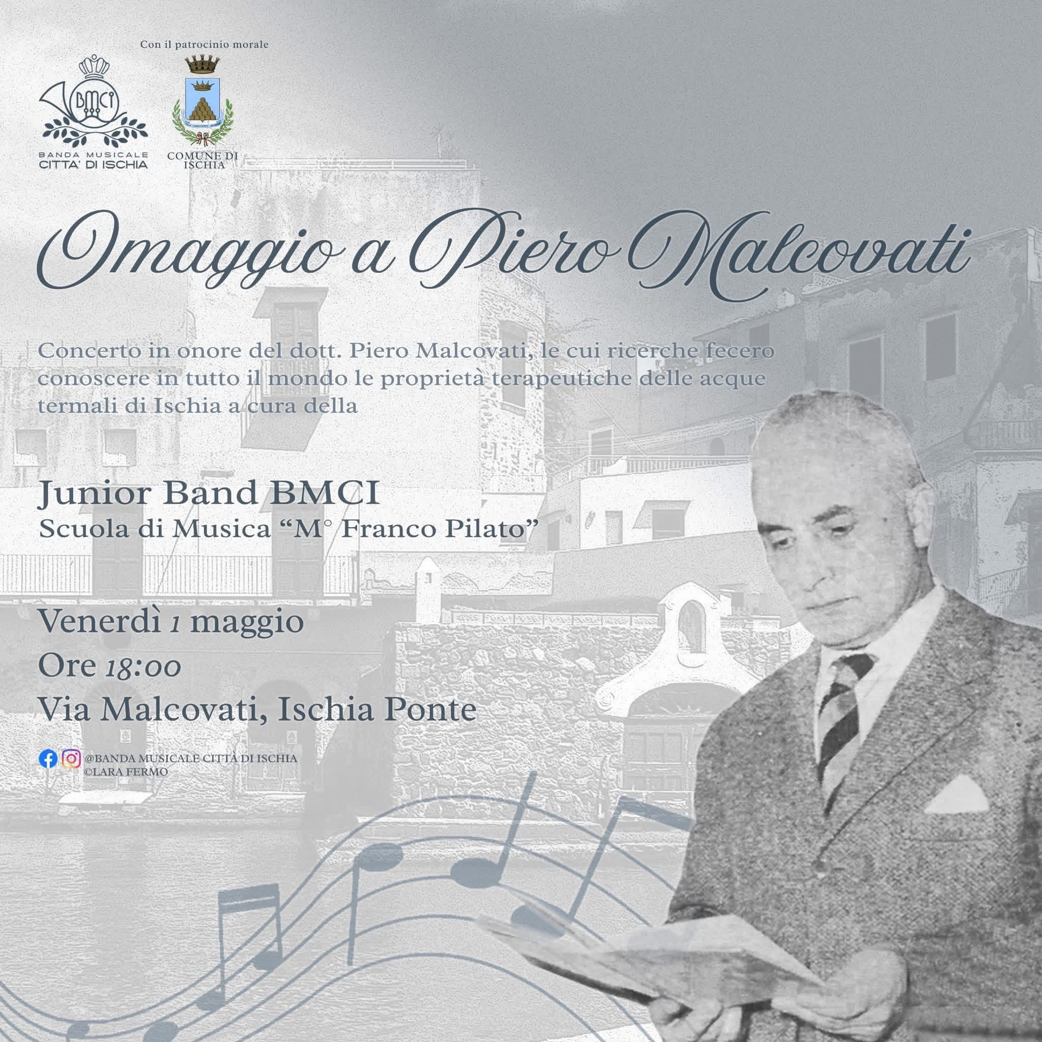 «Il dove l’abbiamo detto. Il perché? Per omaggiare una figura importante della nostra storia: il dott. Piero Malcovati. Ginecologo e idrologo di fama mondiale, già Presidente della Fondazione della Società termale di Lacco Ameno. Il suo nome è legato indissolubilmente allo sviluppo del termalismo ischitano. Quindi vi aspettiamo il 1° Maggio, ore 18:00, Via Malcovati, Ischia Ponte».