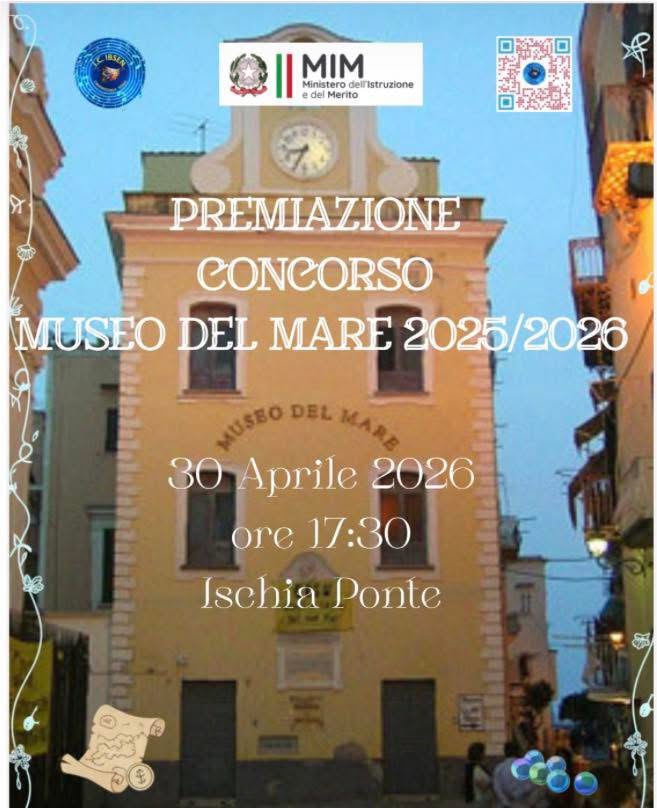 Giovedì 30 aprile 2026 alle ore 17:30, a Ischia Ponte, si terrà la cerimonia conclusiva e la premiazione del Concorso “Museo del Mare” a.s. 2025/2026. L’appuntamento è al Piazzale delle Alghe o in piazzetta limitrofa.