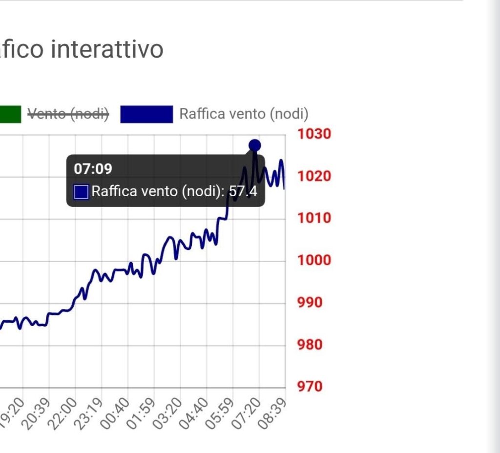 Un dato significativo, che conferma la potenza della perturbazione in atto e che potrebbe non rappresentare il valore massimo della giornata: nelle prossime ore, infatti, sono possibili ulteriori raffiche ancora più intense.