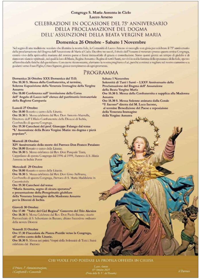 Dal 26 ottobre al 1° novembre, la comunità di Lacco Ameno si stringe attorno alla Congrega di S. Maria Assunta in Cielo per commemorare con solennità e gioia il 75° anniversario della proclamazione del dogma dell’Assunzione della Beata Vergine Maria. Un evento che affonda le sue radici in una tradizione secolare e che continua a illuminare la vita spirituale del paese.
