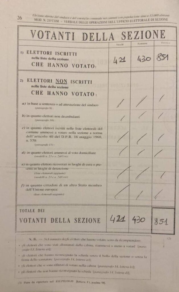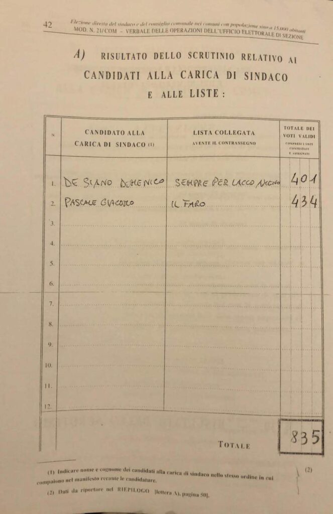 Come potete verificare dalle foto allegate il totale dei votanti della sezione n.3 è di 851, al quale vanno sottratte 7 schede bianche + 8 schede nulle + 1 contestata e non assegnata a De Siano, per un totale dunque di 835 schede; di queste 401 a favore di De Siano e 434 a favore di Pascale.