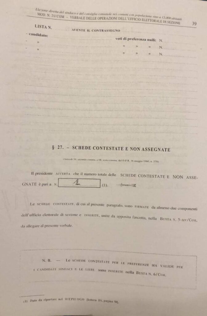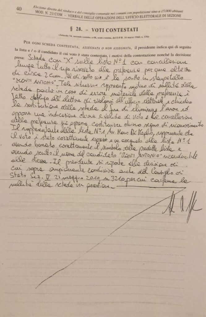 La verità è che anche in questa sezione esiste un voto mancante ma anche questo è a favore di De Siano e si tratta di una scheda contestata e non assegnata (RIPETIAMO) a favore di De Siano (vedi foto allegate).