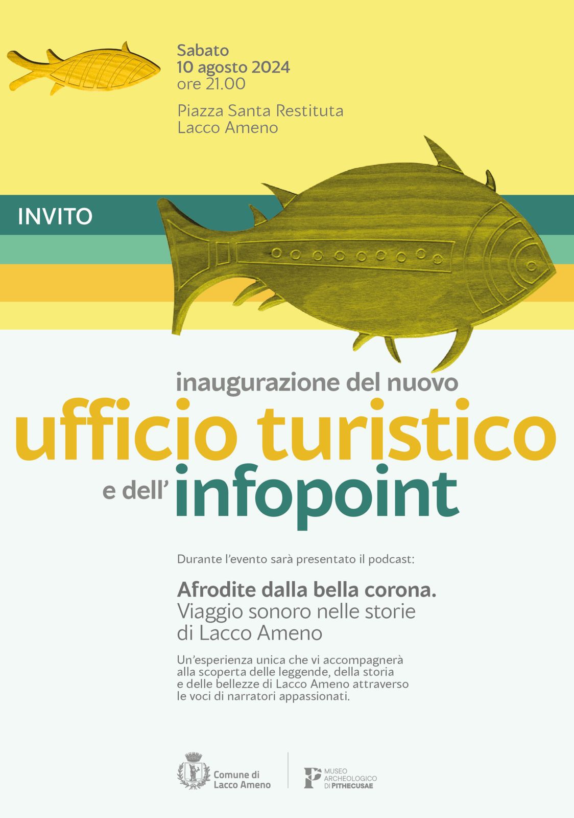 Durante la serata, nel sagrato della Basilica di Santa Restituta saranno presentati al pubblico i primi due episodi del podcast “Afrodite dalla bella corona”, viaggio sonoro tra fede, mito e storia prodotto da Studio A e realizzato da RMS in esclusiva per il Comune di Lacco Ameno.