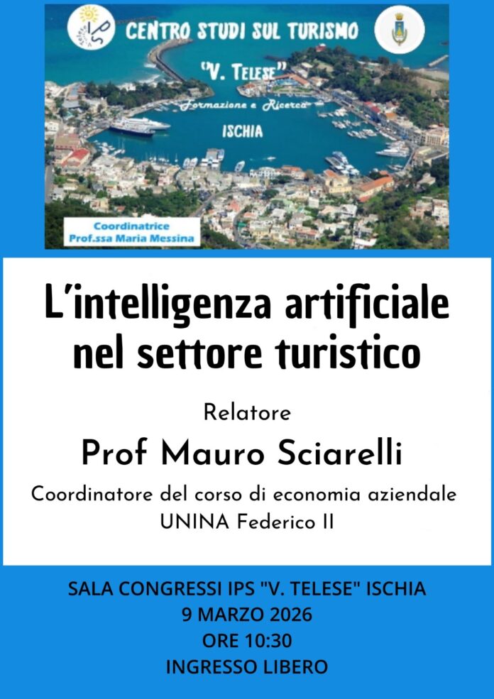 Il mondo del turismo guarda al futuro e lo fa partendo dall’innovazione. Lunedì 9 marzo 2026, alle ore 10:30, la Sala Congressi dell’IPS “V. Telese” di Ischia ospiterà un appuntamento di grande interesse culturale e professionale: l’incontro dal titolo “L’intelligenza artificiale nel settore turistico”, promosso dal Centro Studi sul Turismo “V. Telese” nell’ambito delle attività di formazione e ricerca coordinate dalla prof.ssa Maria Messina.