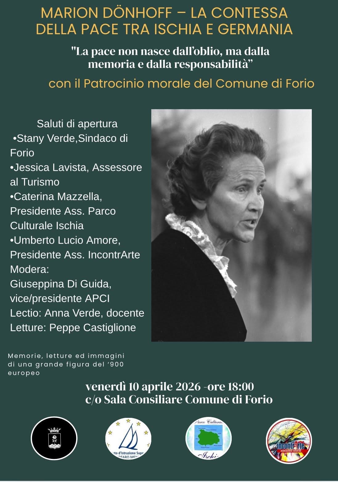 Il Comune di Forio vi invita all’incontro dedicato alla figura di Marion Dönhoff, tra memorie, letture e immagini di una protagonista del ’900 europeo.