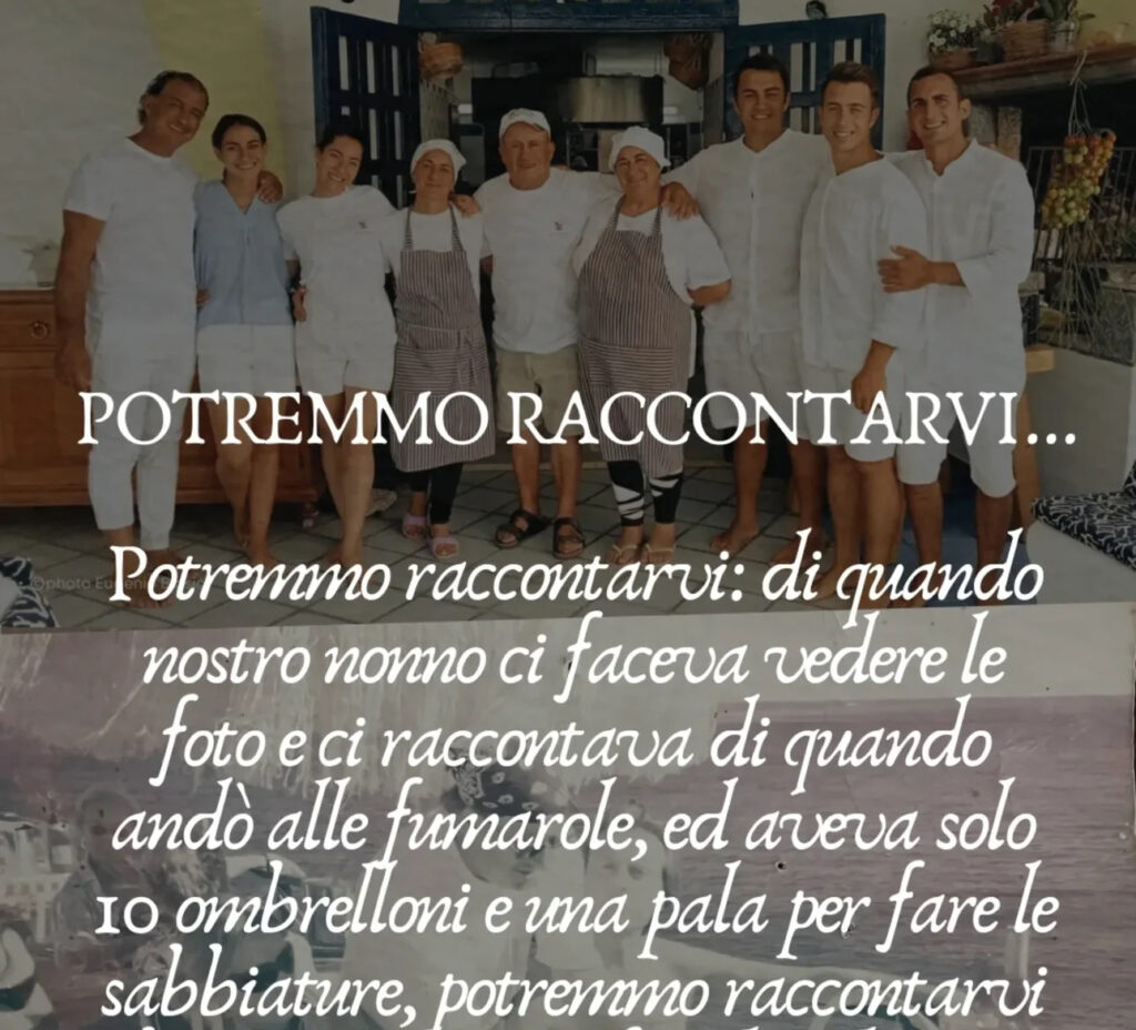 “Potremmo raccontarvi di quando nostro nonno ci faceva vedere le foto e ci raccontava di quando andò alle Fumarole, ed aveva solo 10 ombrelloni e una pala per fare le sabbiature. Potremmo raccontarvi che sempre lui per fare la selezione della clientela aveva sempre il portone chiuso, oppure di quando ogni inverno il mare ci distruggeva e puntualmente le nostre madri ed i nostri zii erano lì pronti a ricostruire per iniziare una nuova stagione. Potremmo raccontarvi di quando è venuto a mangiare da noi Diego Armando Maradona, per citare solo uno tra le celebrità che sono passate nel corso dei nostri 60 anni di storia, ma oggi non lo faremo”.