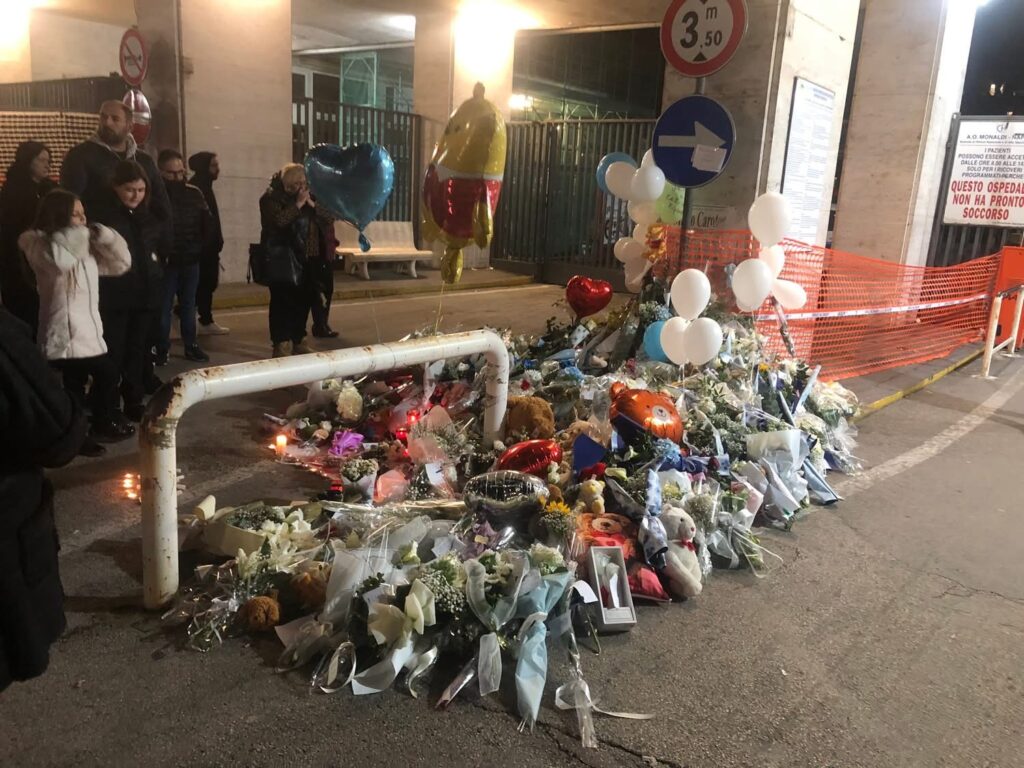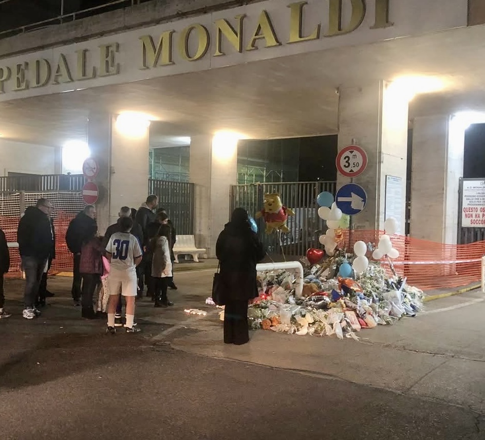 All’esterno dell’ospedale Monaldi di Napoli si è formata una distesa di fiori, peluche e biglietti che raccontano, più di qualunque parola, il dolore di un’intera comunità. Gli omaggi sono per il piccolo Domenico, il bambino scomparso dopo un trapianto di cuore rivelatosi errato, una vicenda che ha scosso profondamente l’opinione pubblica.