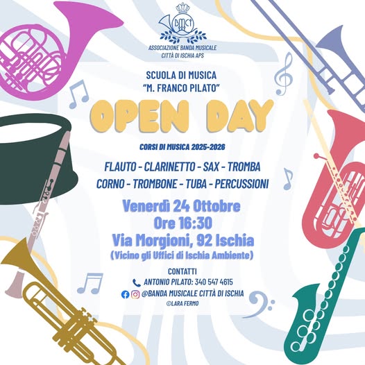 L’Associazione Banda Musicale Città di Ischia APS invita tutti gli interessati all’Open Day della sua Scuola di Musica “M. Franco Pilato”, in programma venerdì 24 ottobre alle ore 16:30 presso la sede di Via Morgioni 92, Ischia, accanto agli uffici di Ischia Ambiente.