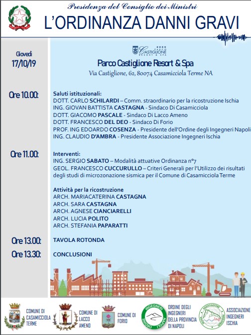 “L’ordinanza danni gravi”. E’ questo il tema di un incontro tecnico che si svolgerà domani, giovedì 17 ottobre, a partire dalle ore 10, nella sala Ulisse del Parco Castiglione Resort & Spa. Ad aprire l’appuntamento i saluti istituzionali del commissario straordinario per la ricostruzione Carlo Schilardi, dei sindaci Giovan Battista Castagna, Giacomo Pascale e Francesco Del Deo, del prof. Edoardo Cosenza (presidente dell’Ordine degli Ingegneri di Napoli) e dell’ing. Claudio D’Ambra. Interverranno l’ing. Sergio Sabato (relativamente alle modalità attuative dell’ordinanza e il geologo Francesco Cuccurullo (criteri generali per l’utilizzo dei risultati degli studi di microzonazione sismica per il Comune di Casamicciola Terme). Spazio poi ai tecnici comunali Mariacaterina Castagna, Sara Castagna, Agnese Cianciarelli, Lucia Polito e Stefania Paparatti prima della tavola rotonda e delle conclusioni che chiuderanno di fatto la mattinata di lavori. L’evento è promosso dai Comuni di Casamicciola Terme, Lacco Ameno e Forio, dall’Ordine degli Ingegneri della Provincia di Napoli e dall’Associazione Ingegneri Ischia.