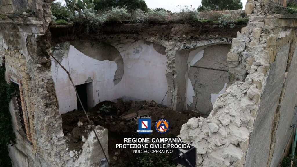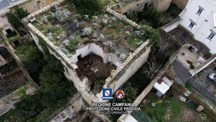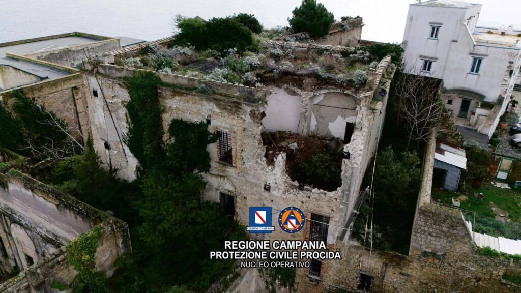 La Protezione Civile di Procida è intervenuta già nella giornata di domenica nell’area del recente crollo dell’ex caserma delle guardie, documentando con un report fotografico lo stato critico della struttura ottocentesca. Le immagini, come sottolinea il sindaco Dino Ambrosino, mostrano con evidenza la dinamica del degrado: infiltrazioni dal tetto, vegetazione infestante, cedimento dei solai e crolli delle pareti. Un quadro che racconta decenni di abbandono, oltre cinquant’anni, e che oggi impone interventi urgenti.