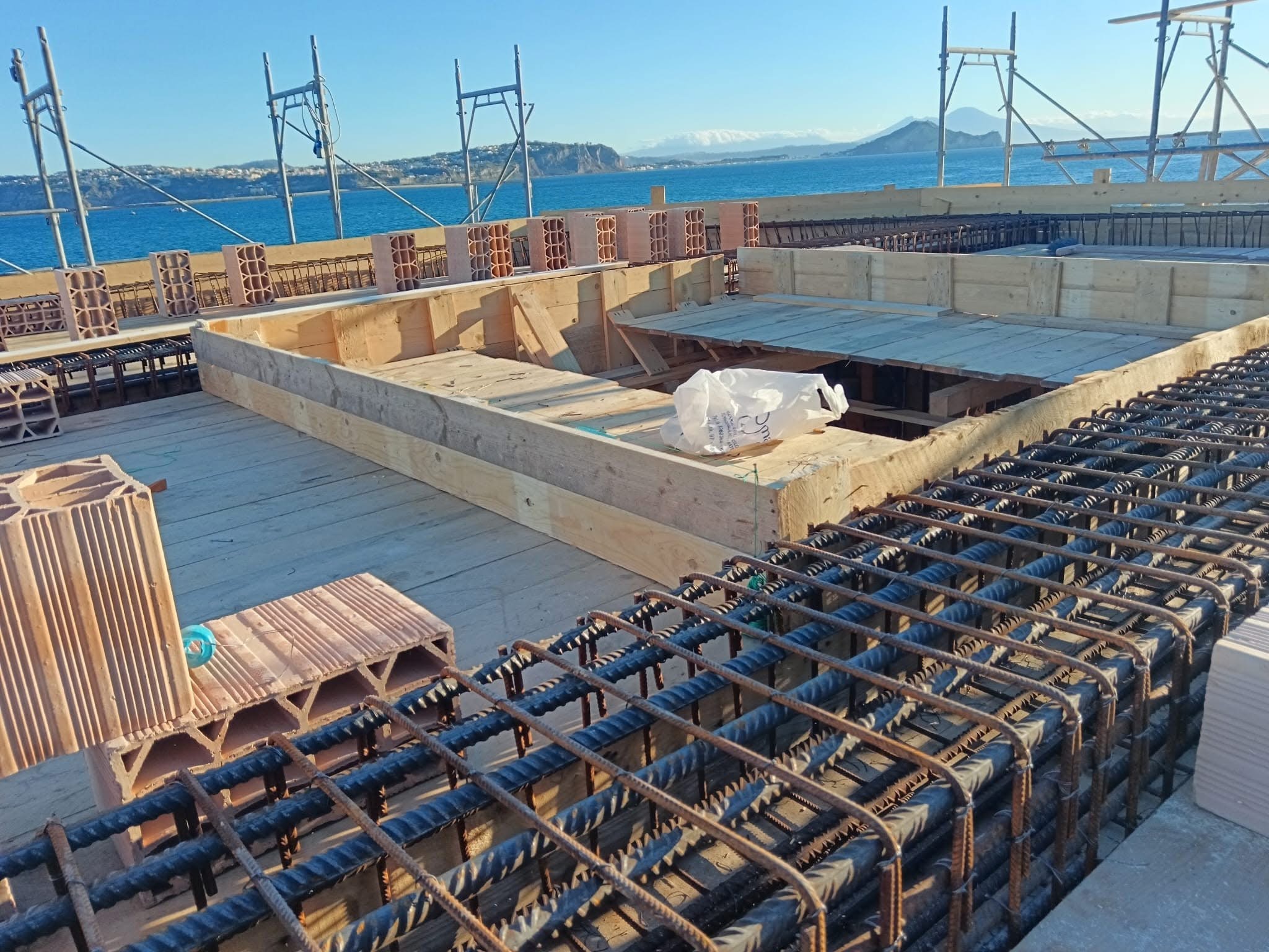La struttura, di forma esagonale, presenta un vuoto centrale che ospiterà l’accesso al lastrico solare. Questo sarà reso fruibile in sicurezza grazie alla realizzazione di un muretto di balaustra perimetrale.