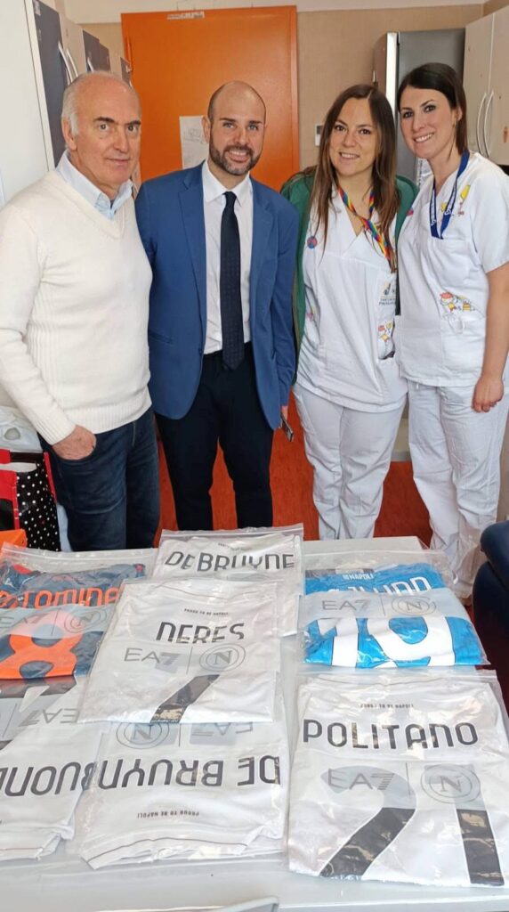 Da quel momento è nata l’iniziativa “Regala un Sorriso Azzurro”, un progetto che porta gioia ai piccoli pazienti attraverso doni, incontri e momenti di leggerezza, spesso legati alla passione per la squadra del cuore.