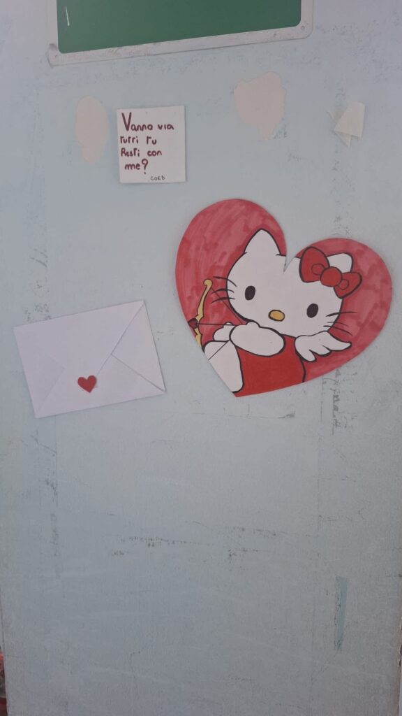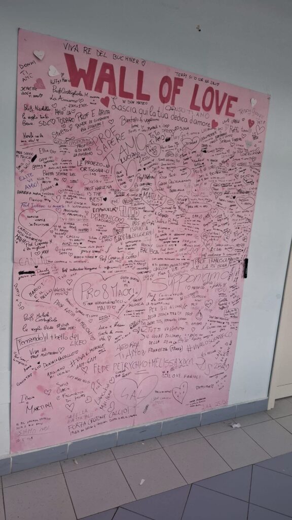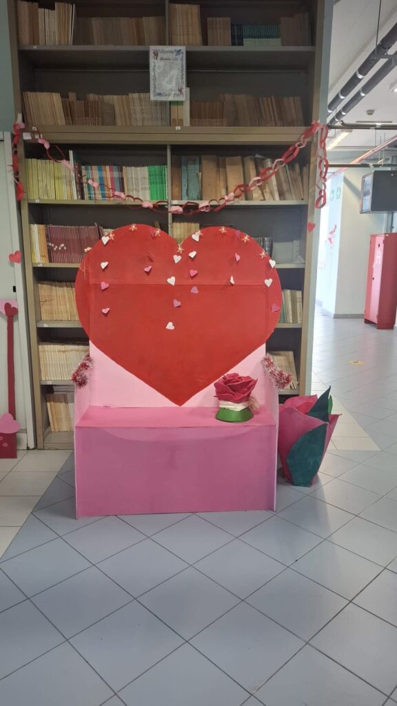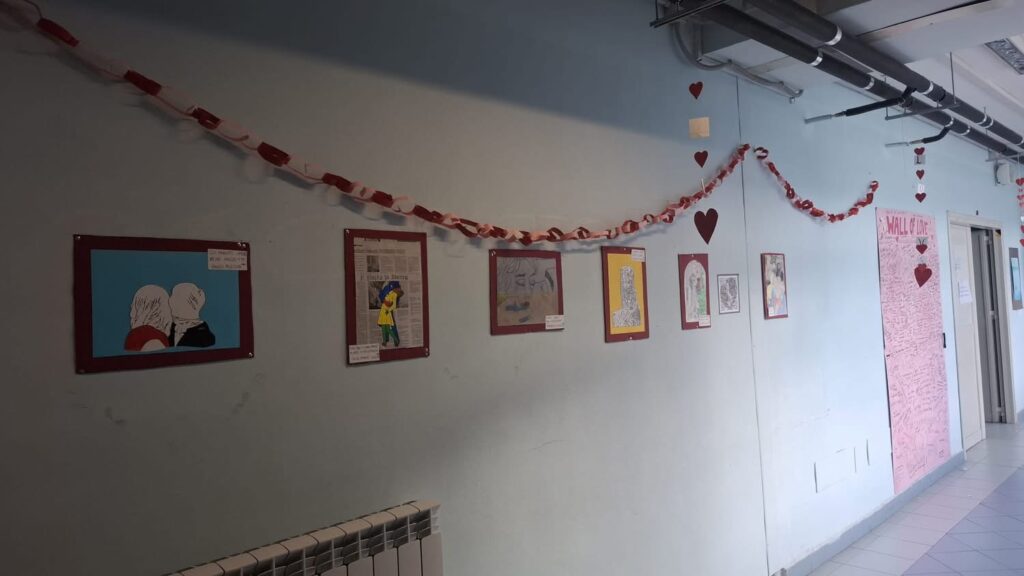 Cuore dell’iniziativa sono stati gli allestimenti realizzati dai ragazzi: dalla Panchina dell’Amore, simbolo di accoglienza e gentilezza, al Love Wall, un grande pannello su cui studenti e studentesse hanno lasciato dediche, pensieri e messaggi rivolti anche ai docenti. A completare il percorso, una galleria di immagini dedicate alla pace e una selezione di “Baci celebri” della storia dell’arte, reinterpretati o studiati per l’occasione.