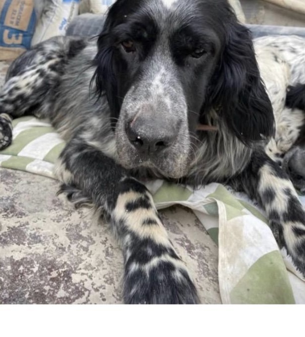 Zarko è un setter di taglia media, mantello bianco e nero con macchie scure. È buono e si lascia avvicinare facilmente.
