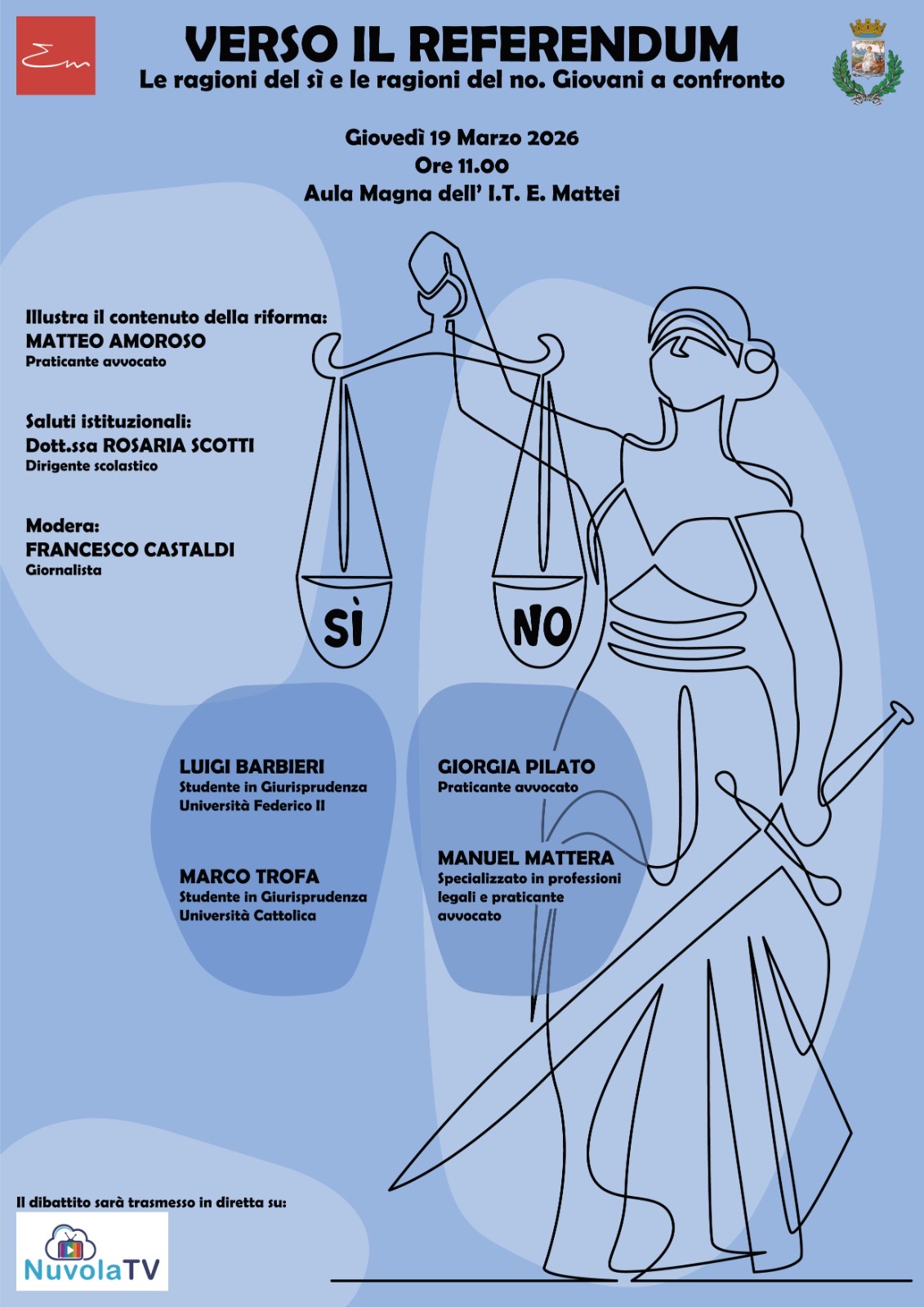 L’incontro “Verso il Referendum” del 19 marzo 2026 alle ore 11 all’I.T. “E. Mattei” sarà un momento di confronto tra studenti e giovani professionisti del diritto sulle ragioni del Sì e del No alla riforma oggetto di referendum. Dopo i saluti della dirigente Rosaria Scotti, il praticante avvocato Matteo Amoroso illustrerà i contenuti della riforma. Il dibattito, moderato dal giornalista Francesco Castaldi, vedrà intervenire Luigi Barbieri, Marco Trofa, Giorgia Pilato e Manuel Mattera, offrendo punti di vista diversi per aiutare gli studenti a formarsi un’opinione consapevole. L’evento sarà trasmesso in diretta su NuvolaTV.